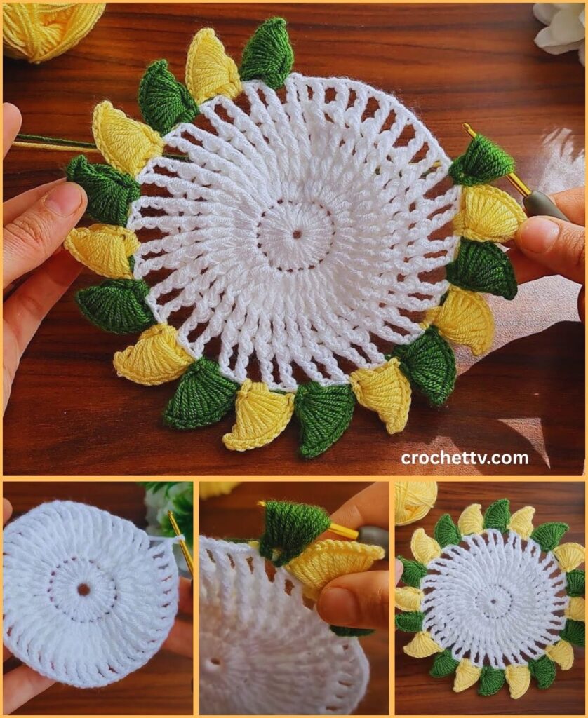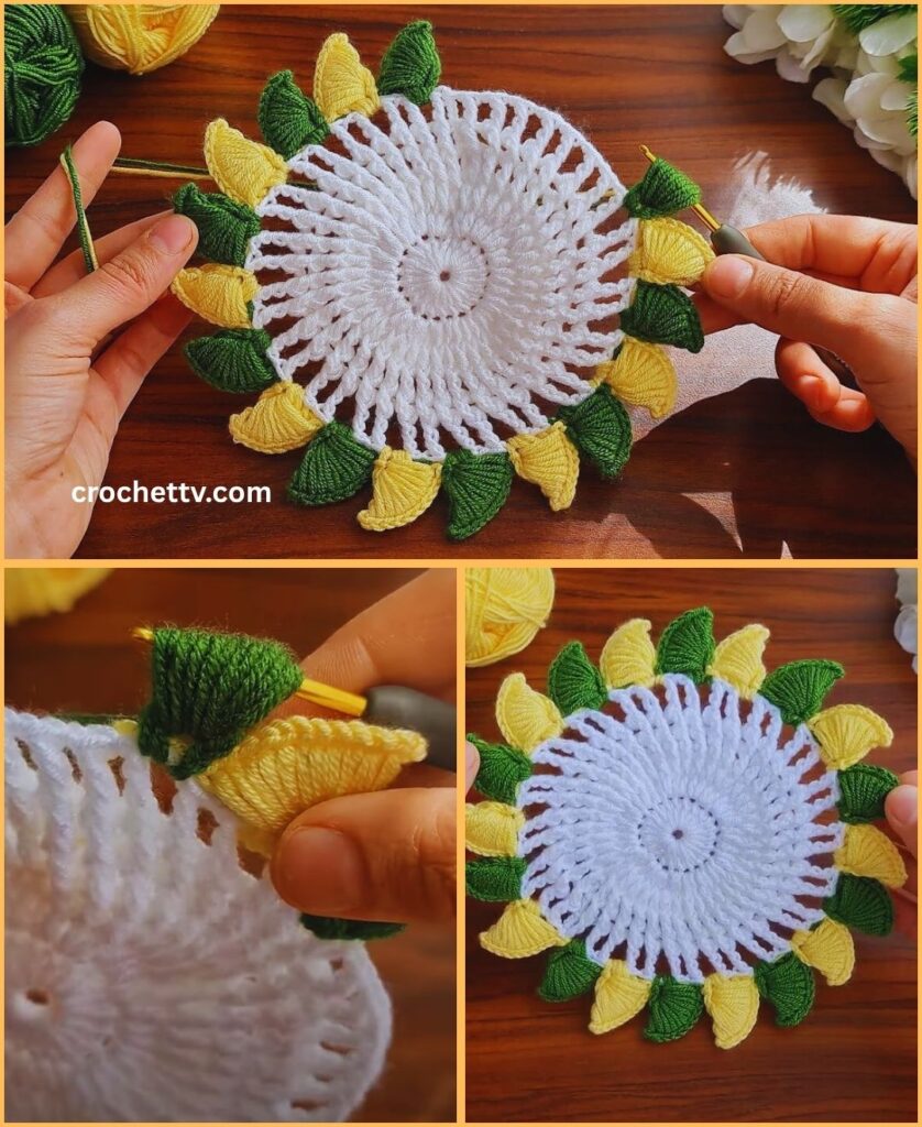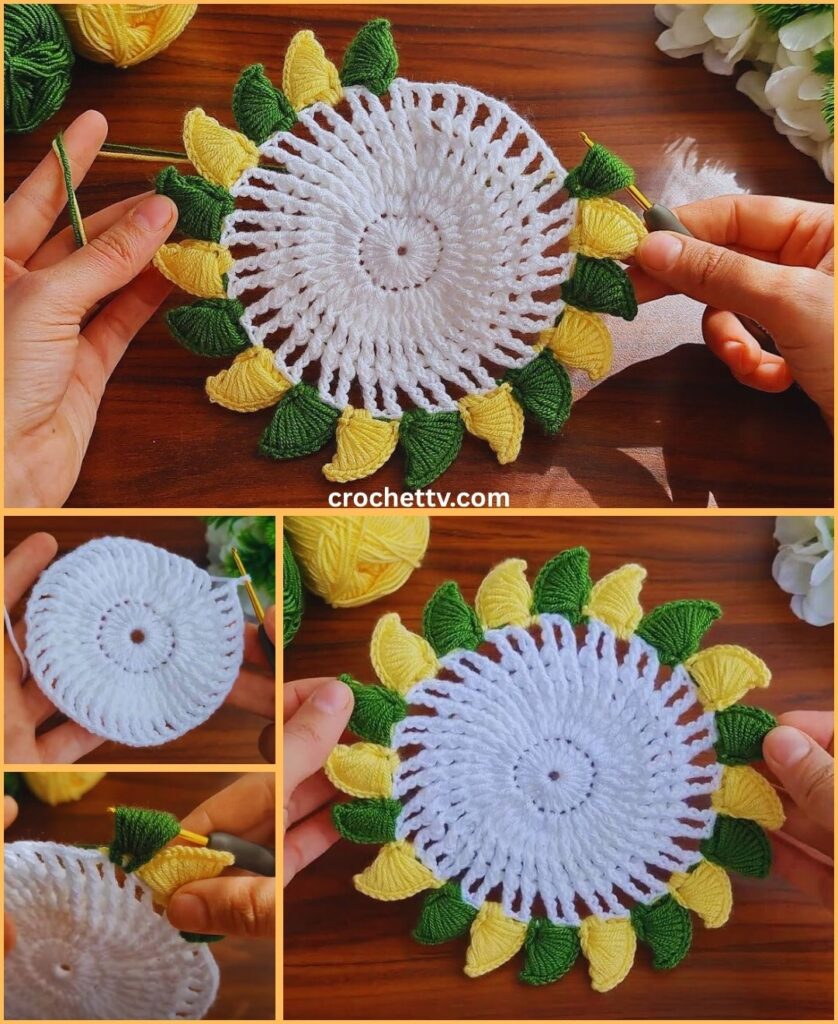 - Use a smaller hook or fewer stitches for a smaller coaster, and larger yarn or add rounds for a placemat-sized piece.