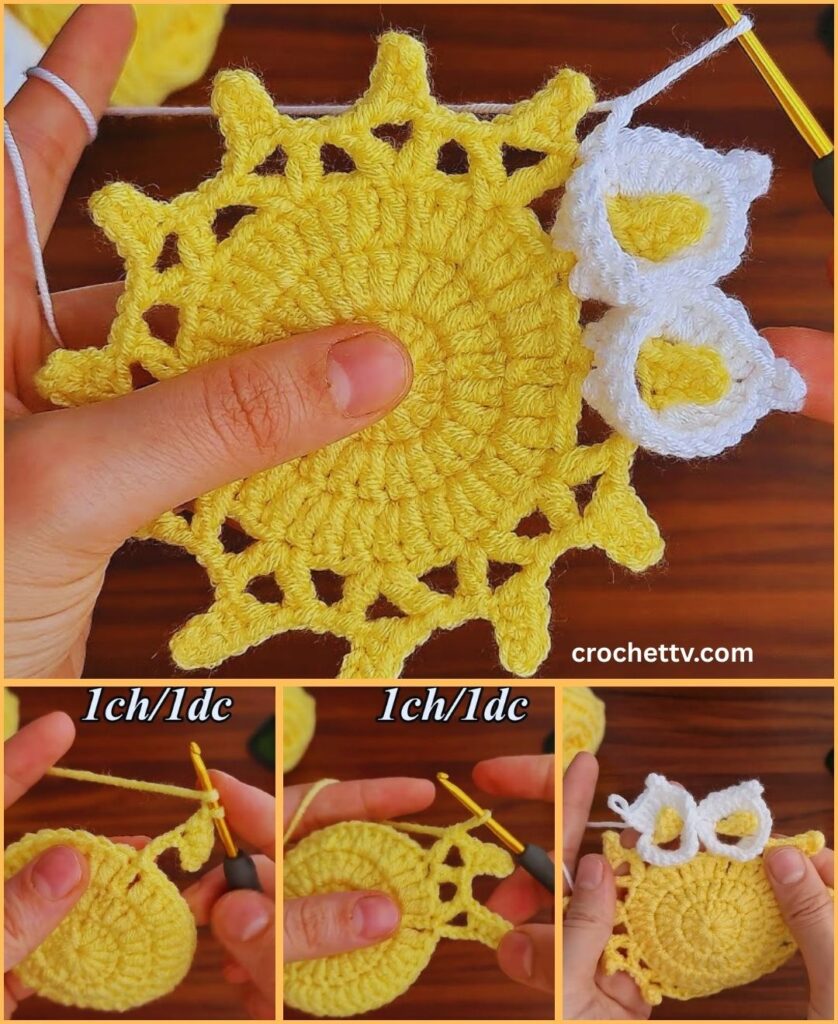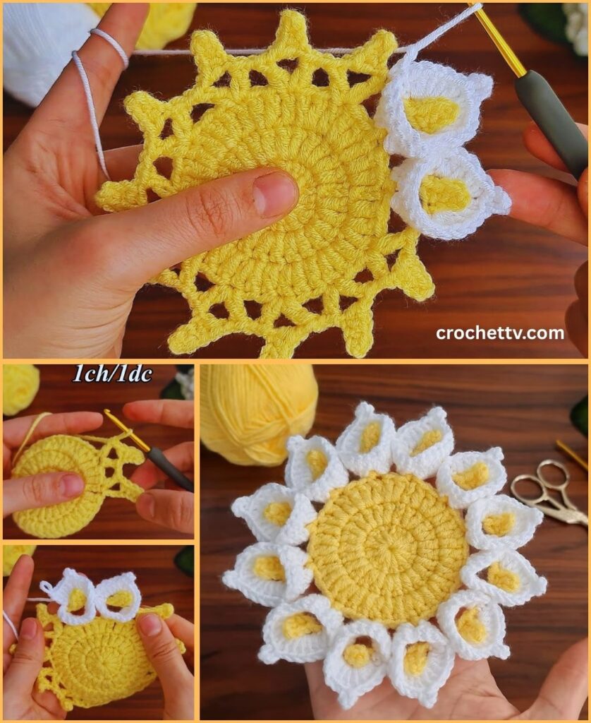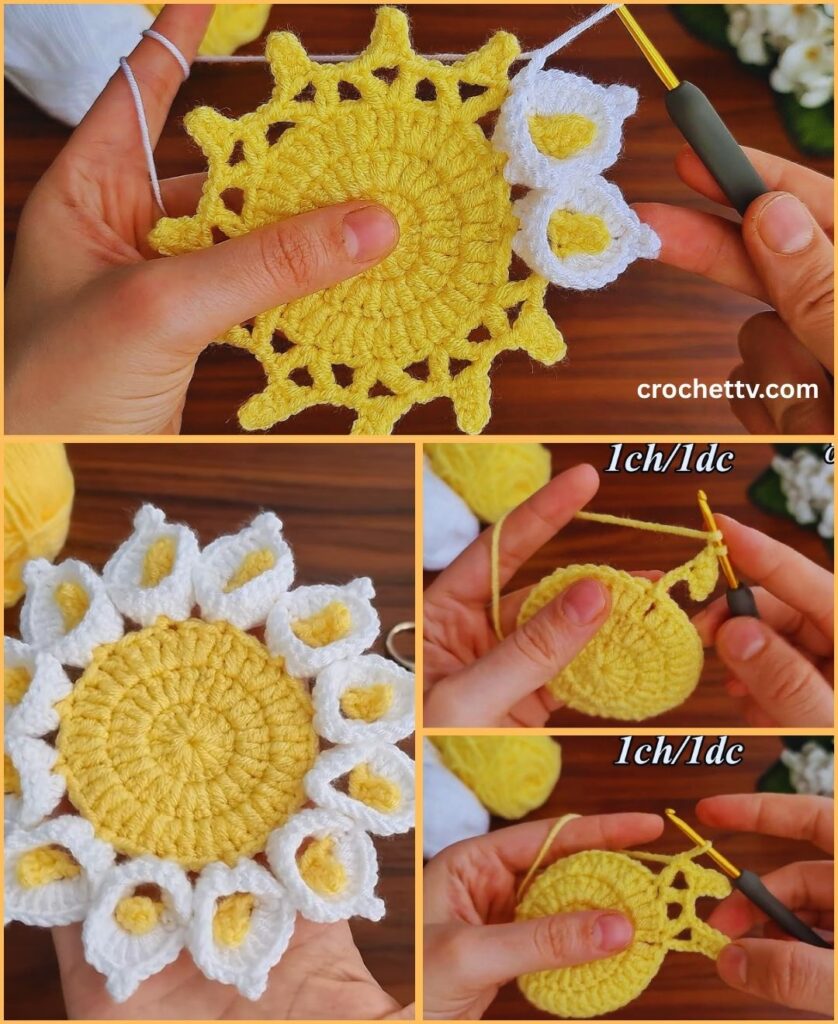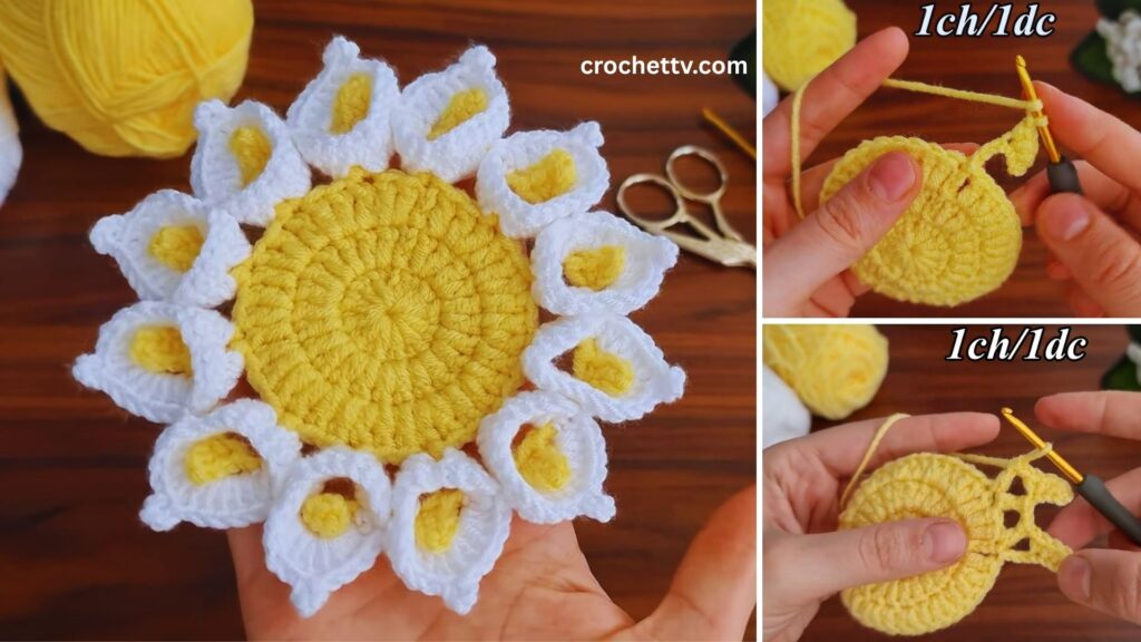 - (sc in center dc of each petal, ch 3) โ repeat to the end.