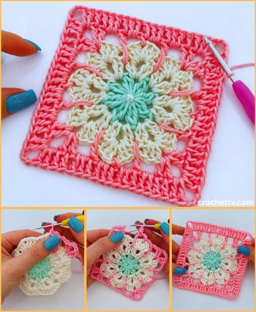 - The Square Border: The final rounds that use classic granny stitch techniques to build out the square shape around the central floral motif.
