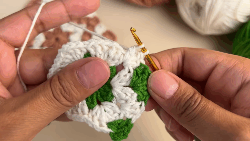 - Round 4 (Setting Up Corners):sl st into the next two dc’s, and sl st into the ch-1 space.