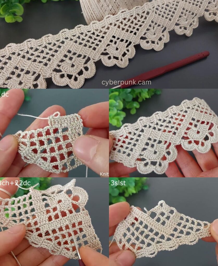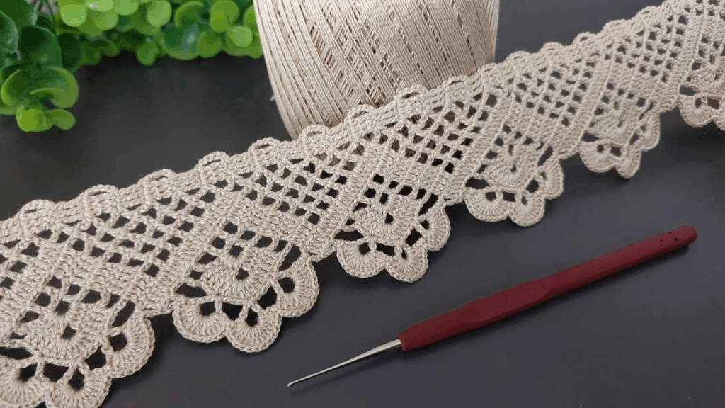 This tutorial details a classic, beginner-friendly lace border design called the “Shell and Picot Edging.”