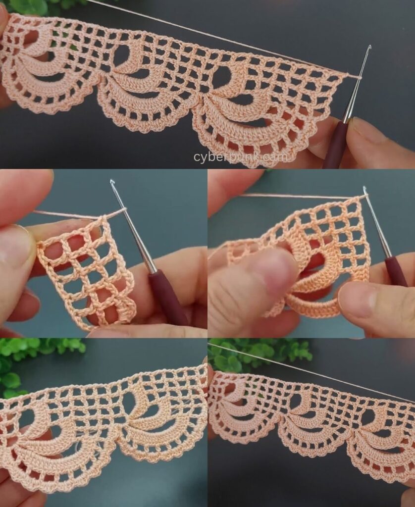 - sl st in the 2nd ch from hook. sc in the next ch. hdc in the next ch. dc in the last ch.