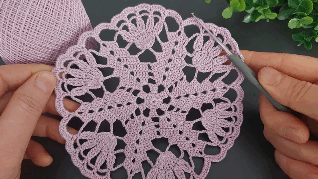 The final rounds focus on opening up the space between the large petals and finishing the edge with picots.