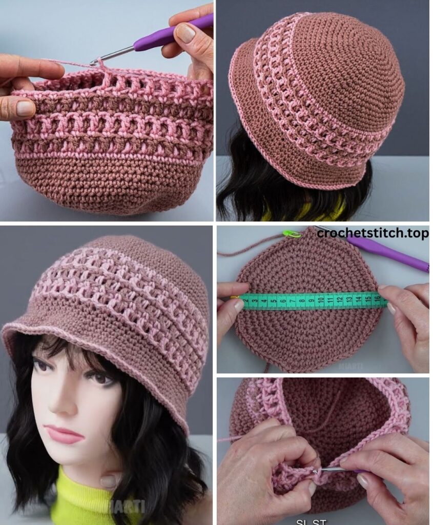 Continuing the Brim: Continue this pattern for a few more rounds, increasing the number of (dc, ch 1) clusters between the increases. The more rounds you work, the wider the brim will be. Most bucket hats have a brim that is 2-4 inches wide.