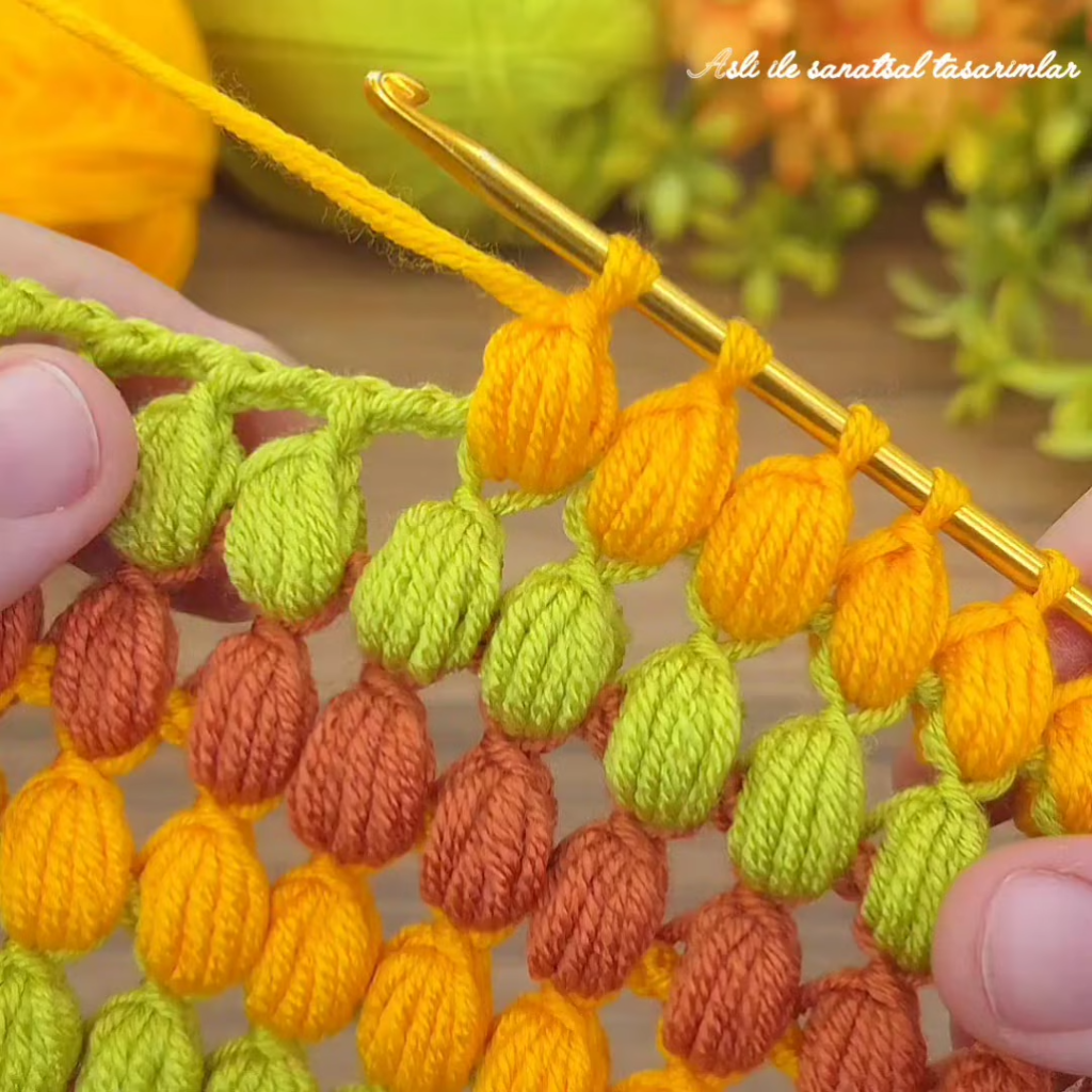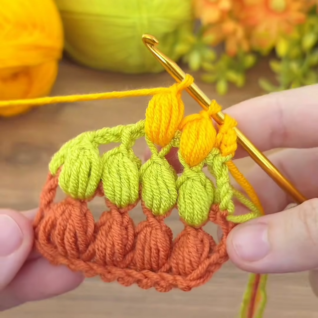 A popcorn stitch is a raised, bobble-like stitch created by working multiple stitches into the same space and then joining them together. In Tunisian crochet, popcorn stitches stand out even more because of the firm fabric structure.